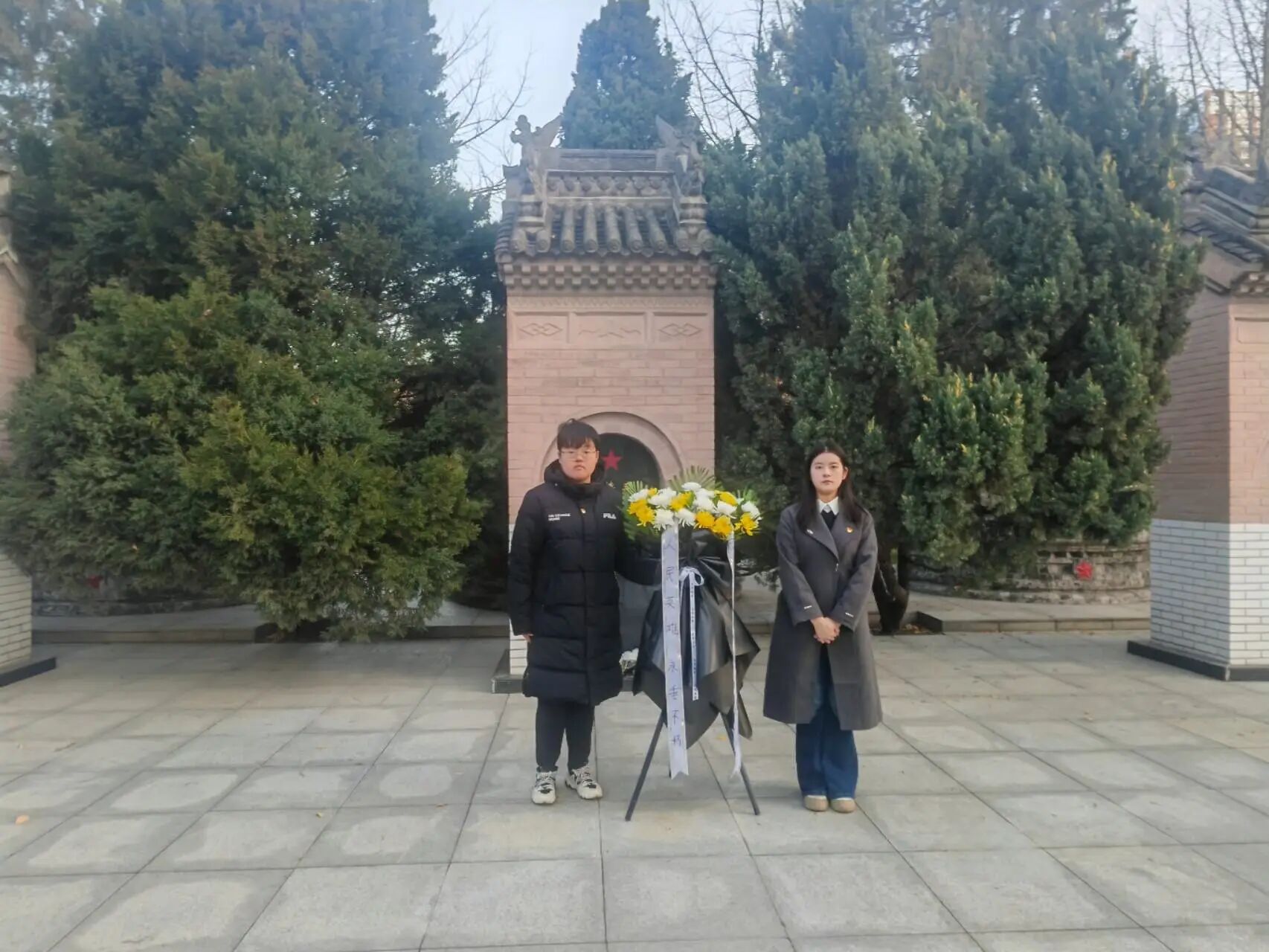 默哀毕,党员代表杨淳、郑佳宜缓步上前,向烈士纪念碑敬献花篮,并仔细整理挽联。朵朵鲜花寄托着后辈对先烈无尽的哀思与追念。