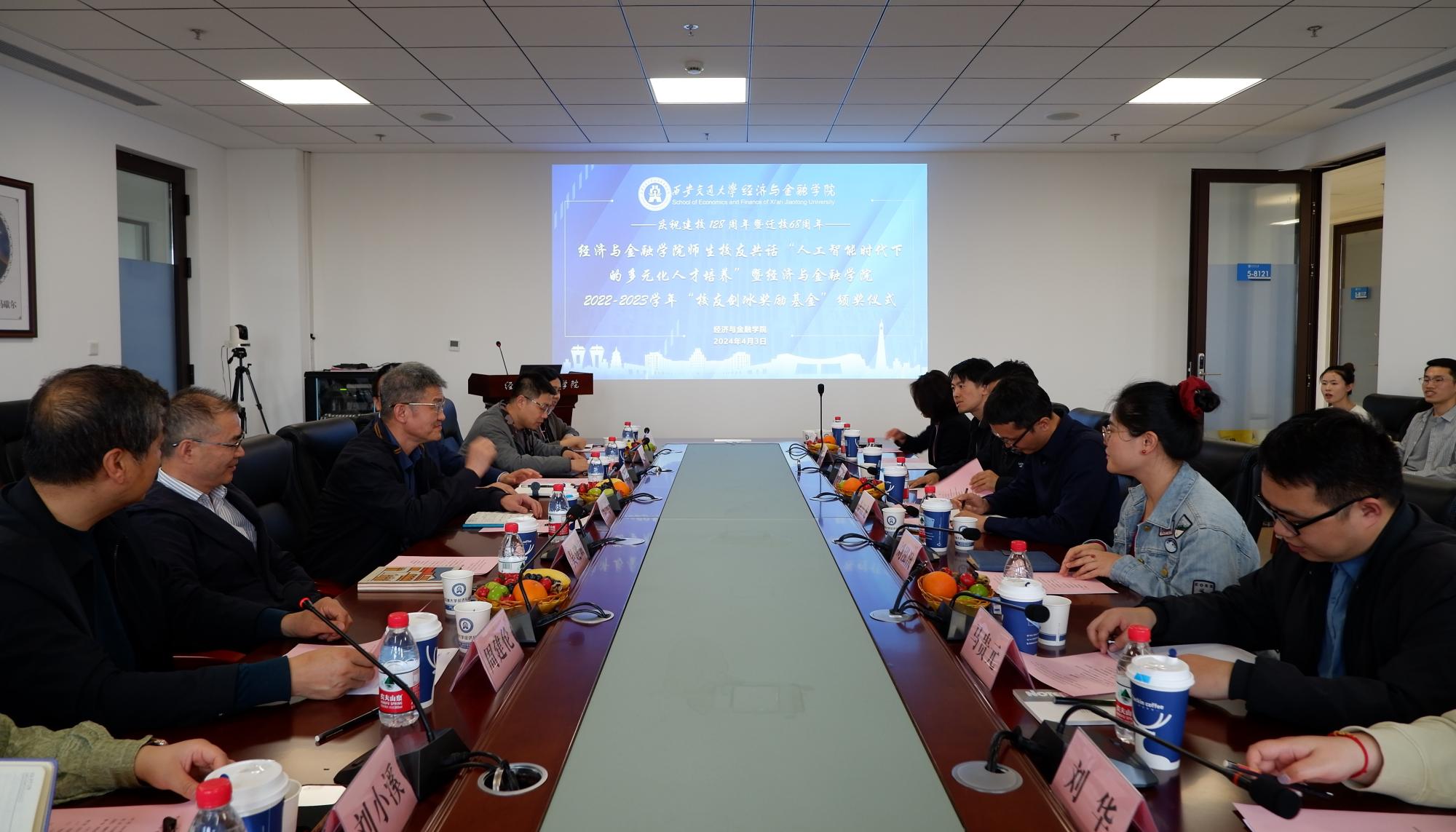 建校128周年暨迁校68周年,深入探索人工智能时代下的多元人才培养新模式,进一步激励交大学子饮水思源、接续奋斗,2024年4月3日下午,经金学院于创新港成功举办了师生校友共话“人工智能时代下的多元人才培养”暨2022-2023学年“校友剑冰奖励基金”颁奖仪式。校党委副书记、经金学院院长孙早,“校友剑冰奖励基金”设立人吴建斌校友,校教育基金会秘书长邢晓强,经金学院党委书记周建伦,副院长沈灏,党委副书记刘小溪,启德书院院务副主任李华及学院师生代表共计40余人参加。本次会议由经金学院党委书记周建伦主持。