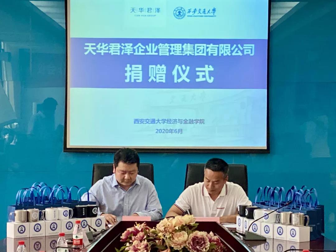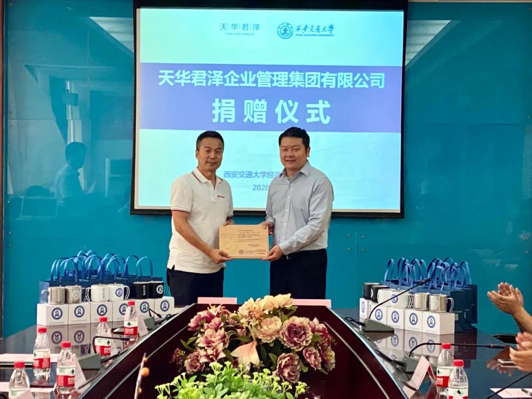 在经金学院建院20周年之际,广大校友积极向学院捐款捐物,为学院发展添砖加瓦。适逢毕业季,北京天华君泽集团合伙人、西安分公司总经理田立川校友向学院捐赠1200套毕业生纪念礼品套装,用于赠送2020级毕业生。6月12日,捐赠仪式在经金学院806会议室隆重举行。北京天华君泽集团合伙人、西安分公司总经理田立川,副总经理王福厚,漫蛙漫画