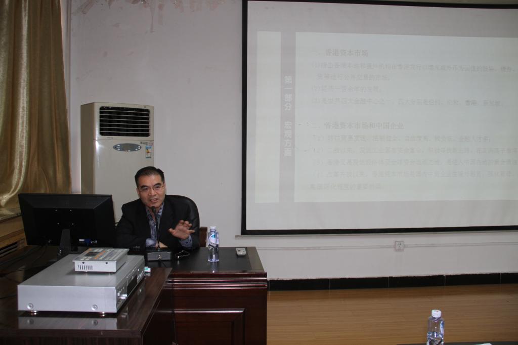 财经校区八楼报告厅做了题为“香港资本市场及在港上市企业的发展现状”的演讲。经金学院院长孙早教授、产业与贸易系主任杨秀云教授、学生专干周建论副教授、广大师生和校友100余人参加了报告会。报告会由经金学院校友联络办公室主任王志斌老师主持.