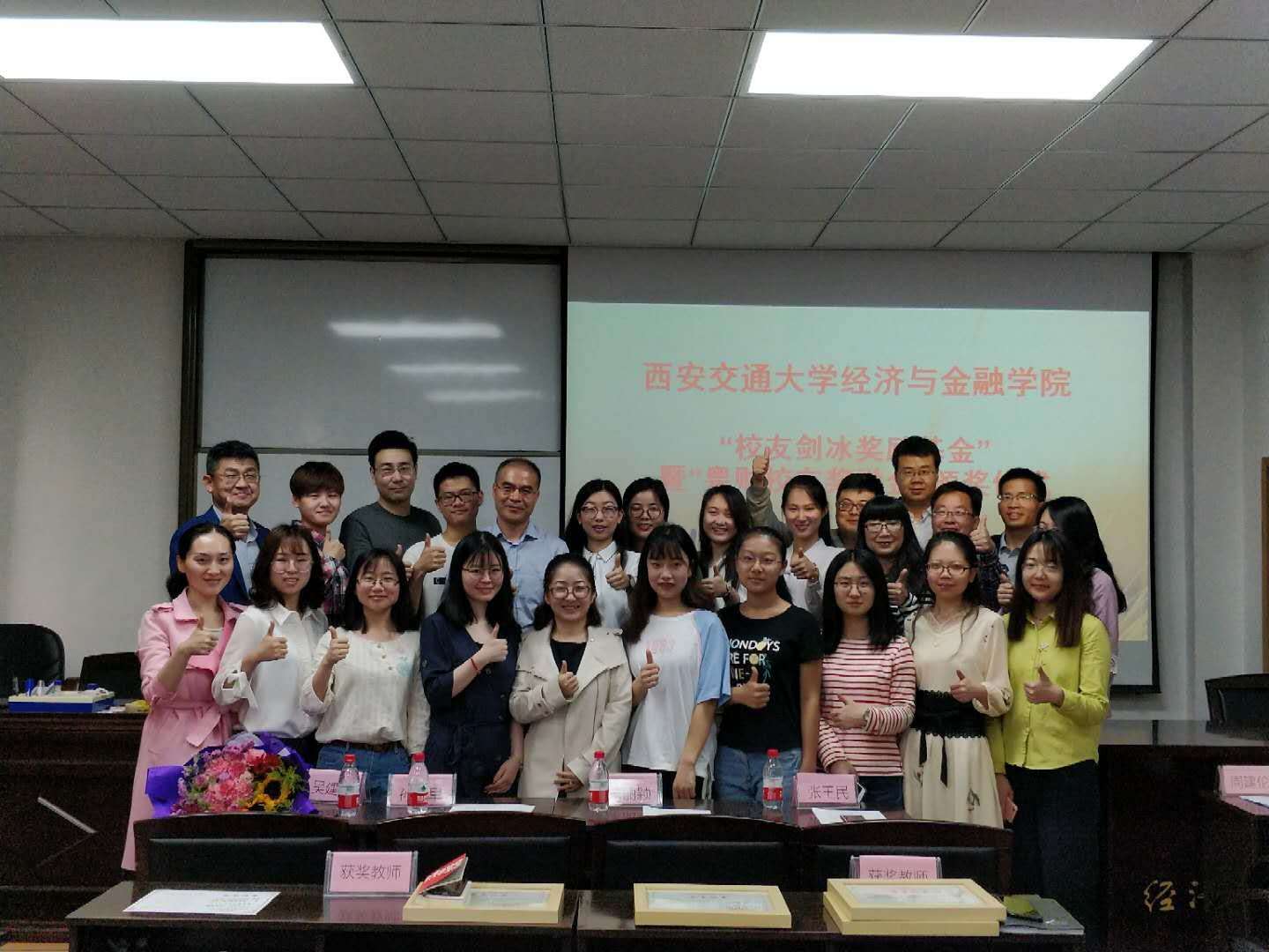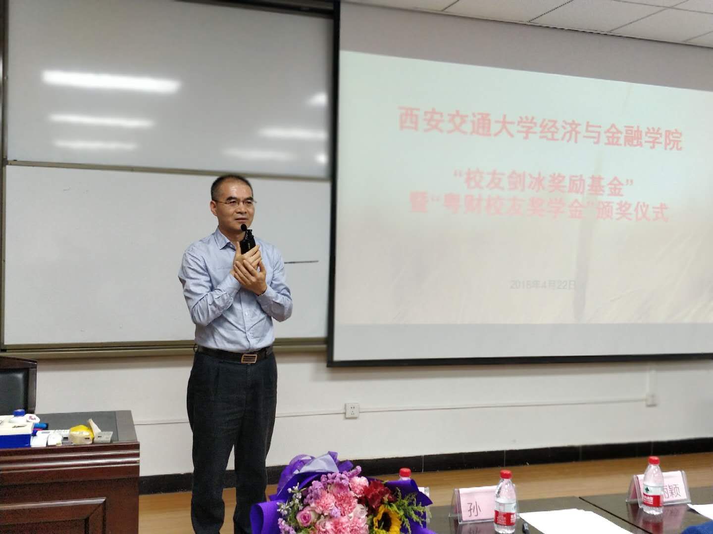 孙早院长发言盛赞建斌学长精于业务、为人谦卑、常怀感恩之心,不仅在业界享有盛誉,更时刻不忘关心和支持母校的人才培养等工作,是我们校友中首屈一指的杰出代表。他同时也感谢捐资设立“粤财校友励志奖学金”的校友们。获奖青年教师代表王乐表示要以以建斌学长的奋斗历程为榜样,“明德于心、感恩于行”,投入更多的热情到工作和科研中来,也希望有朝一日,我们今天的获奖者能够薪火传承,积极回馈社会。获奖学生代表樊锦琳说“落其实者思其树,饮其流者怀其源”;作为交大的一名学子,始终牢记百年交大饮水思源的光辉传统;作为“校友剑冰励志奖学金”的获得者,将牢记建斌学长捐资助学的善举,并致以深深的感谢。