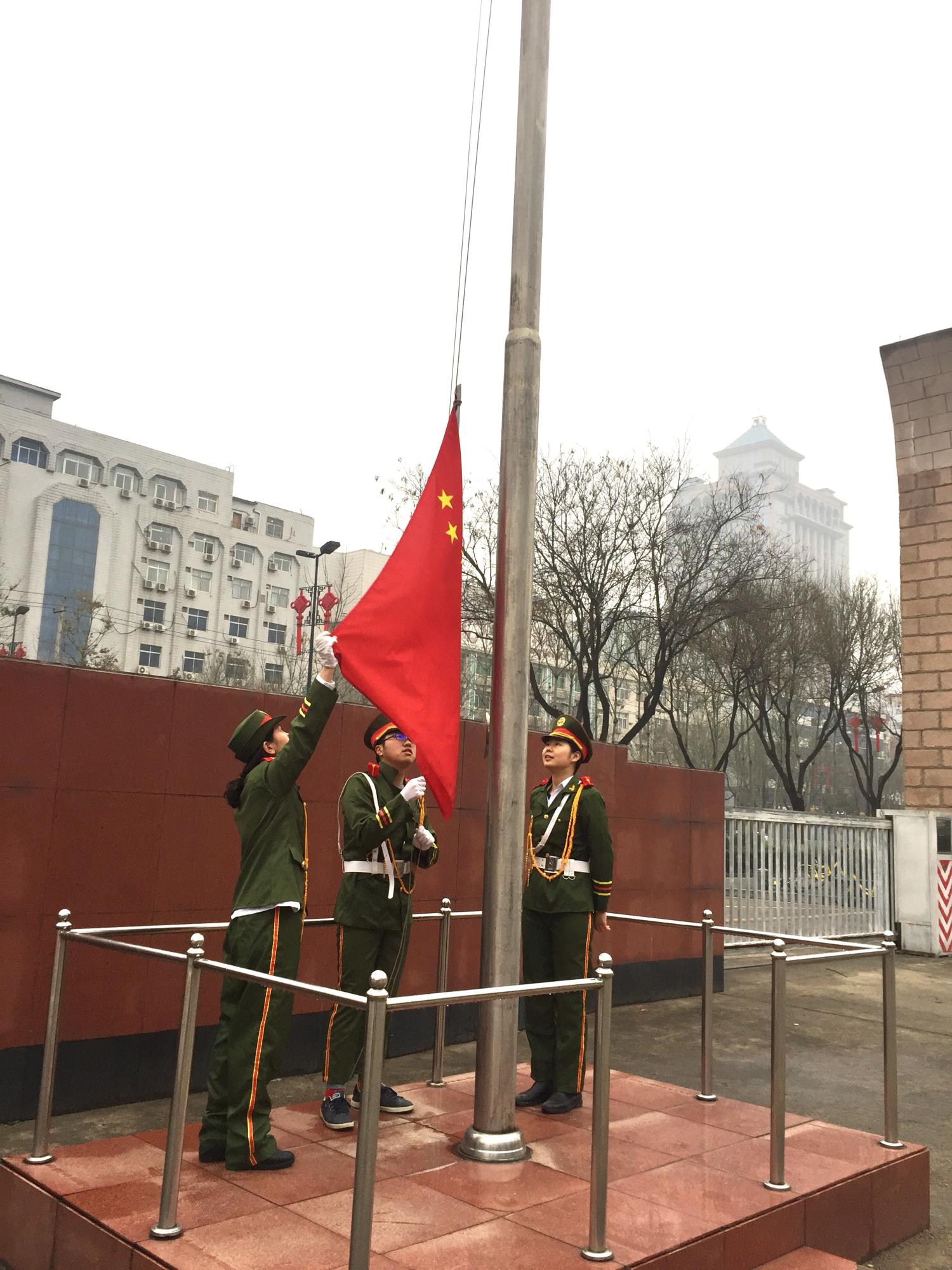 伴着料峭的春风,国旗班升旗手迈着昂扬的步伐,高举鲜艳的五星红旗,走到台前,准备升旗。护旗手护卫国旗上台,伴随着激昂雄壮的国歌声,鲜艳的五星红旗冉冉升起,迎风飘扬,全体同学行注目礼,唱国歌。值此庄严时刻,在场的每一位同学都是既激动又自豪,注视着春风中飘扬的五星红旗,想到革命前辈抛头颅洒热血的激情和勇于拼搏的奋斗精神,眼前浮现出一辈辈的共产党人不忘初心,坚守使命为人民服务的奉献行为,同学们心中无不充满豪情,满怀对祖国的热爱!崭新美好的一天从升旗开始。