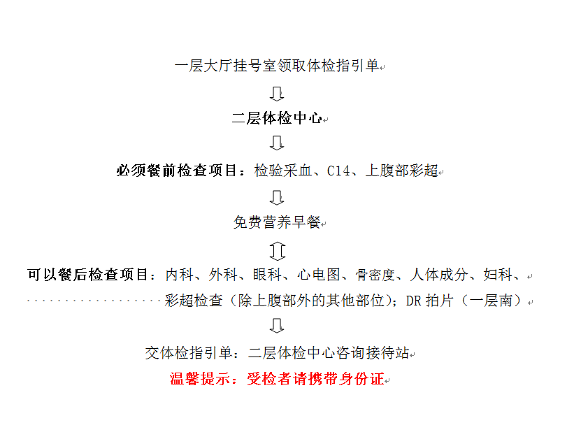 13、请配合医生检查,务必按规定项目检查,不要随意漏查;体检完毕,请您将体检表交回体检中心咨询接待前台。