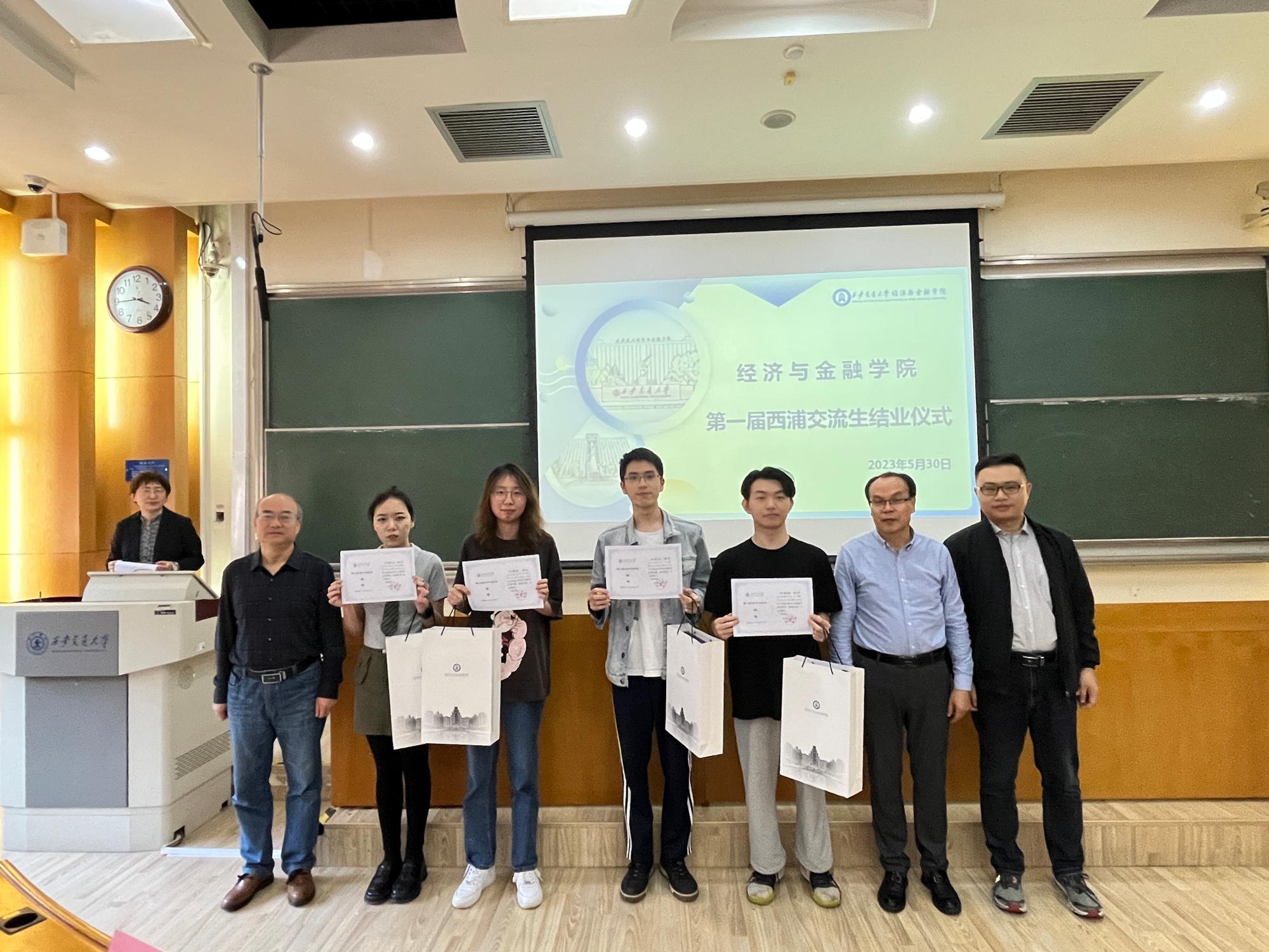 2023年5月31日下午,经金学院第一届西浦交流生结业仪式在兴庆校区教学主楼A-104教室顺利举行。金融系主任何建奎、启德书院院务主任张王民、西浦交流生班主任罗添元、西浦交流生班主任李利芳、授课教师代表贾智杰、马贵元、吴静娴、刘华、西浦辅导员刘雨阳以及经金西浦2101、经金西浦2102全体学员出席,活动由赵春艳副院长主持。