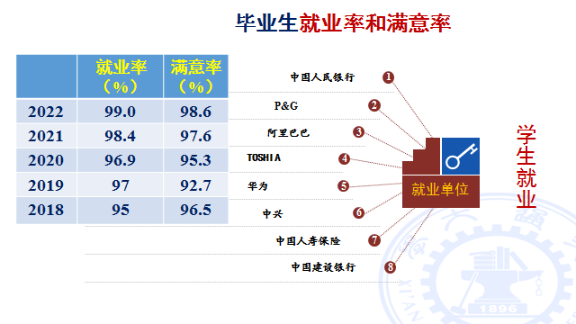 、清华大学、复旦大学、中国人民大学、上海交通大学;国(境)外大学包含美国威斯康辛大学、新加坡国立大学、香港大学、香港科技大学等;毕业生就业面广、前景好,绝大部分选择国有银行、行业龙头企业。