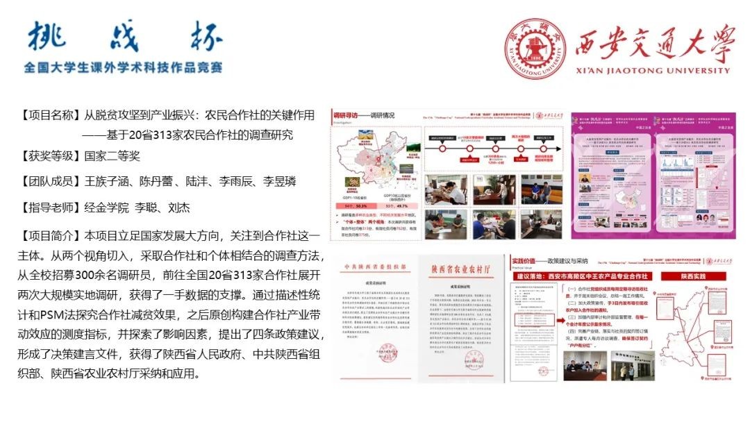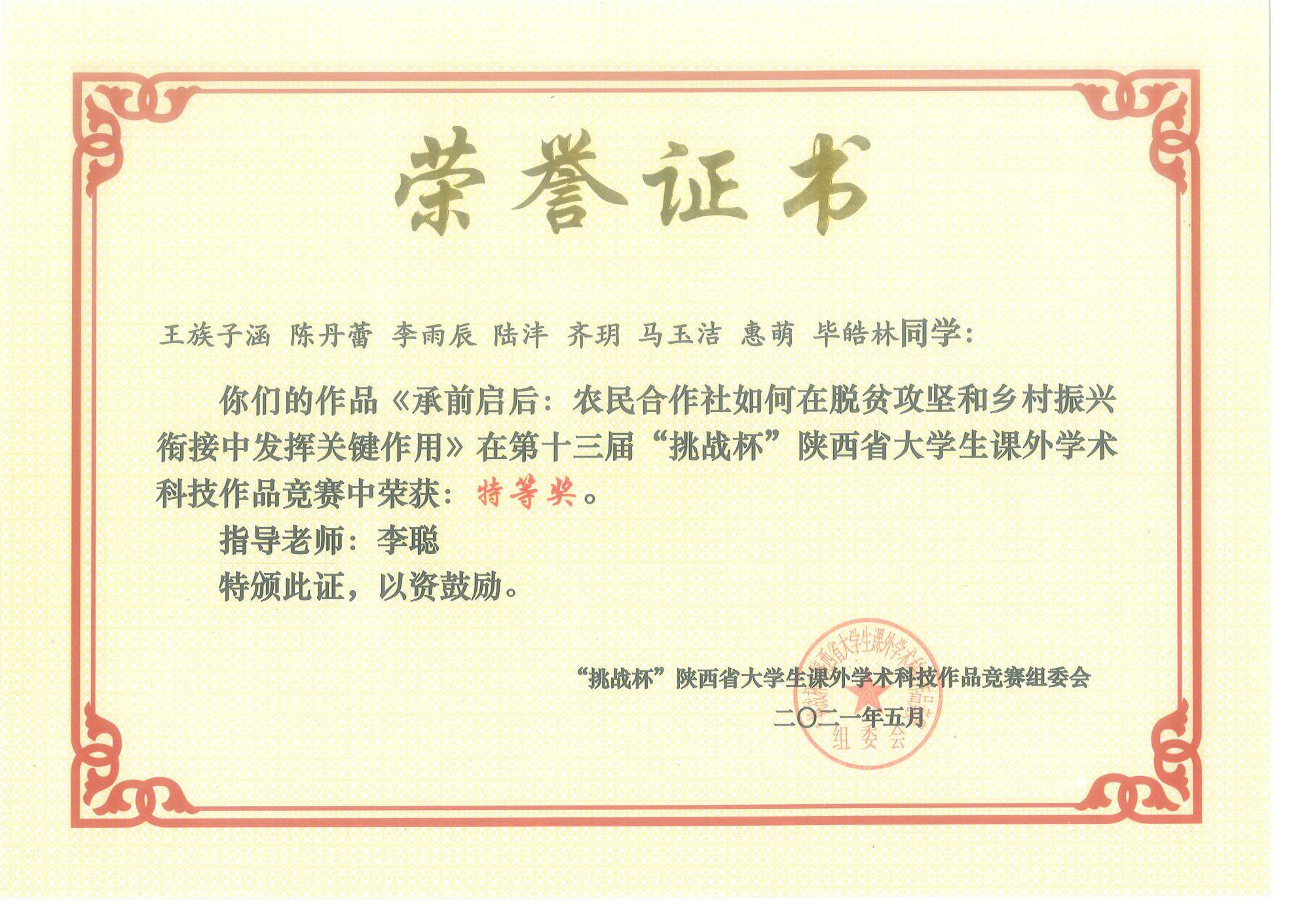 近日,第十七届“挑战杯”全国大学生课外学术科技作品竞赛决赛获奖名单公布,由李聪教授指导,经金学院、启德书院王族子涵同学带队,陈丹蕾、陆沣、李雨辰、李昱璘五位同学共同完成的作品——《从脱贫攻坚到产业振兴:农民合作社的关键作用》从全国2500多所高校的2.2万件作品中脱颖而出,获得陕西省特等奖、国家级二等奖的好成绩。作为我校入围国赛终审决赛的唯一社科类作品,该作品创造了学院参加“挑战杯”课外学术科技作品竞赛的最好成绩,实现了学院项目入围“挑战杯”国家级比赛零的突破。