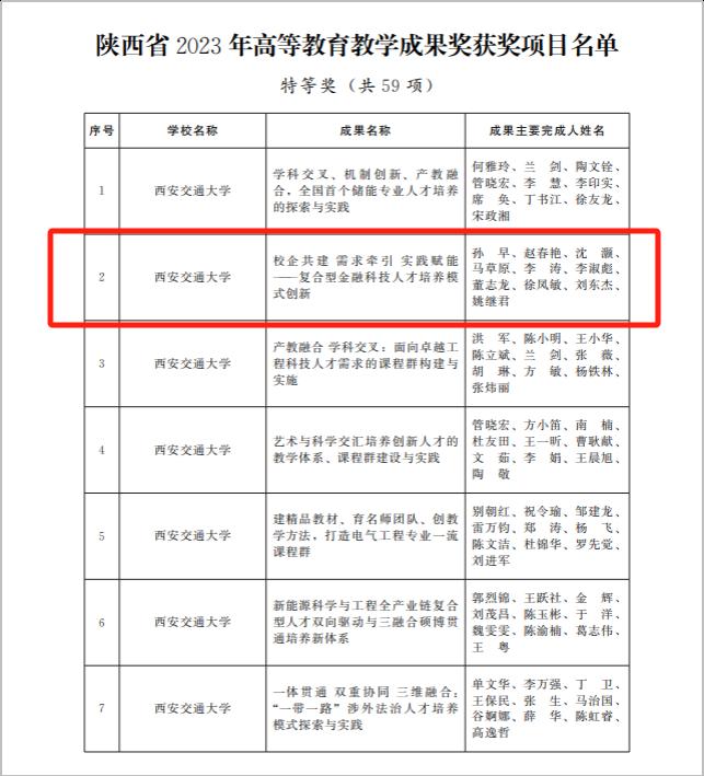 近日,陕西省人民政府办公厅公布“陕西省2023年高等教育教学成果奖获奖项目”名单,经金学院完成的“校企共建需求牵引实践赋能——复合型金融科技人才培养模式创新”项目成果荣获特等奖,此奖项是学院首次荣获省级教学成果特等奖,取得了新的历史性突破。