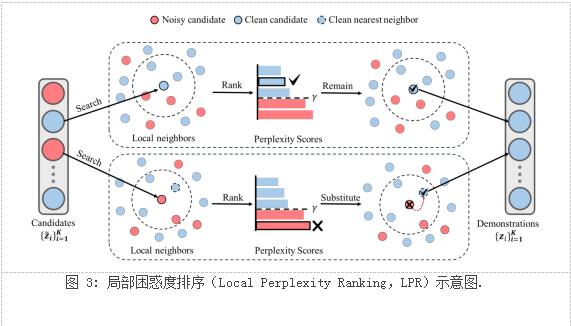 大型语言模型(Large Language Models,LLMs)通过上下文学习(In-Context Learning,ICL)在下游任务中表现出了令人印象深刻的性能,但依赖于从大量注释示例中选择的示例质量。尽管以往研究表明在文本分类中上下文学习对噪声示例具有稳健性,但该论文验证了噪声示例会严重地损害大语言模型在文本生成任务中上下文学习的能力。为此,该论文提出一种简单且有效的方法,局部困惑度排序(Local Perplexity Ranking,LPR),通过将潜在的噪音示例替换为最近邻的潜在干净示例,从而提升大语言模型上下文学习的噪音稳健性。LPR方法的核心思想是,通过在Token空间中对候选示例及其最近邻进行排序来解耦匹配困惑,LPR既可避免原有示例选择方法选择噪音示例,又保持原有示例选择方法的有效性。大量实验证明了LPR的有效性,在具有噪声注释的常见基准上,提高了EM得分高达18.75。