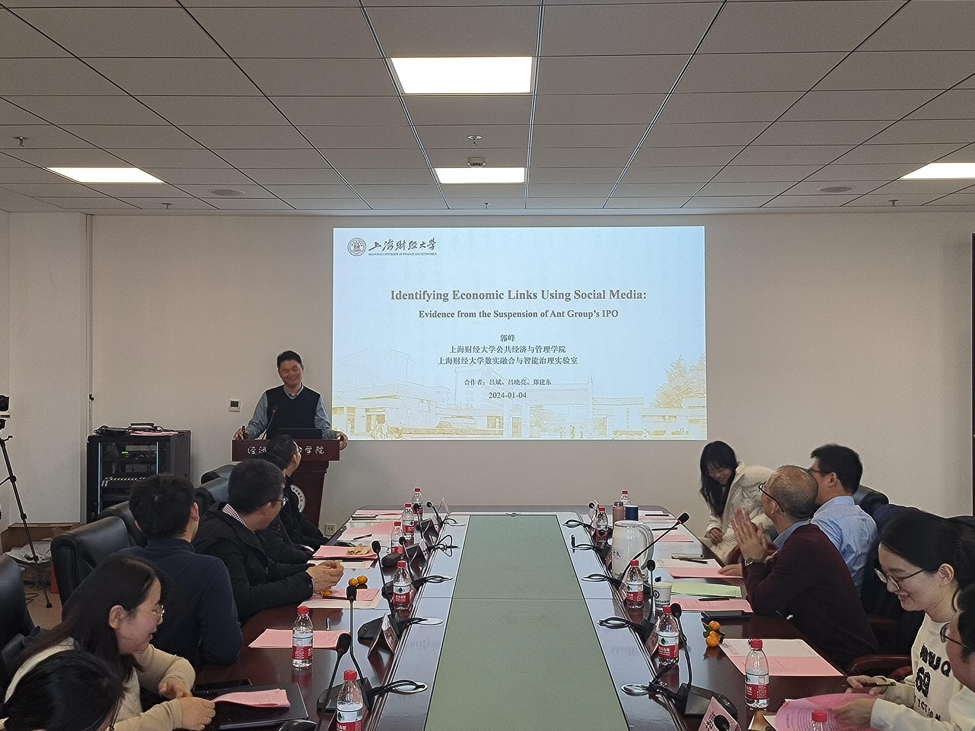 郭峰教授报告了“Identifying Connections between Firms Using Social Media”,该研究介绍了一种利用社交媒体来识别企业之间的经济联系的新方法。利用蚂蚁集团于2020年11月被暂停IPO这一外源性冲击,发现对与蚂蚁集团有社交媒体联系(SMCs)的公司的股价产生了负面影响。此外,这些公司的公司和金融资产投资也受到了影响,证实了SMCs的实际影响。