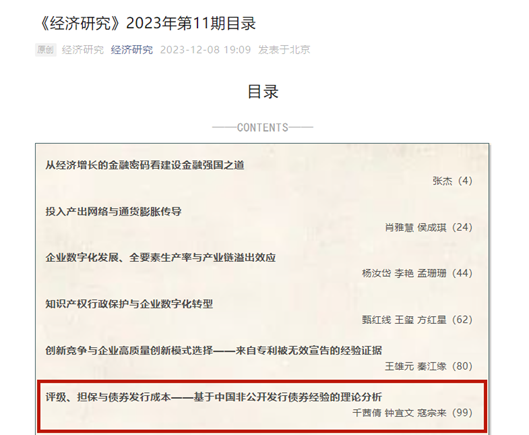 上述研究成果近期以《评级、担保与债券发行成本—基于中国非公开发行债券经验的理论分析》为题发表在我国经济学顶级期刊《经济研究》上,千茜倩是第一作者,漫蛙漫画