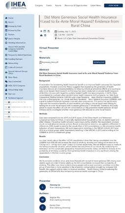 世界卫生经济大会是由国际卫生经济学协会(International Health Economics Association)主办的全球性学术会议,自1996年以来每两年举办一次,是全世界卫生经济学领域最盛大的顶级国际会议。第十五届世界卫生经济大会由非洲最古老的卫生经济学研究中心——开普敦大学卫生经济学部主办,大会主题为“卫生经济学的多样性”(Diversity in Health Economics)。会上,吴静娴助理教授作了题为“Association Between Social Health Insurance and Hypertension Control Among Middle-Aged and Elderly Chinese Adults: A Mediation Analysis”的口头报告,以及题为“Inequality in Unmet Healthcare Needs under Universal Health Insurance Coverage in China”的海报报告。博士生陈丹蕾同学在线作了题为“Impact of Supplementary Private Health Insurance on Preventive Health Behaviors: Evidence from Chinese Middle-aged and Elderly Adults”的海报报告,硕士生刘加旺同学在线作了题为“Did More Generous Social Heath insurance Lead to Ex-ante Moral Hazard? Evidence from Rural Residents in China”的口头报告。以上论文报告从不同角度探讨了我国全民医保制度背景下的居民健康行为与健康结果,均为吴静娴助理教授所主持的国家自然科学基金青年项目的阶段性研究成果。与会专家充分肯定了上述研究的意义,并对研究结果的可推广性展开了深入交流。