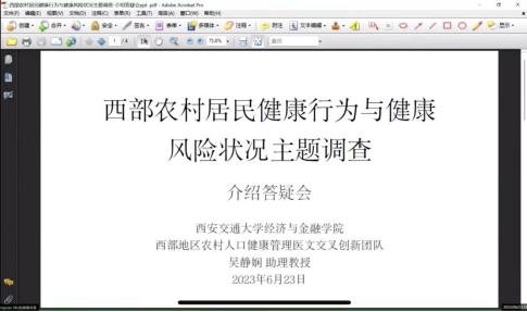 2023年7月3日下午,由经金学院和第一附属医院合作成立的西部地区农村人口健康管理医文交叉创新团队开展的“西部地区农村居民健康行为与健康风险调查”启动仪式暨第一期集中培训会于雁塔校区东配楼顺利进行。本次调查融合健康经济学与实验经济学方法,旨在以陕西省为例,了解掌握西部地区农村居民的家庭一般情况、健康状况、健康行为、风险及时间偏好等信息,为在“健康中国2030”背景下有效干预农村居民的预防性健康行为、提升农村居民的人力资本水平寻找方案。