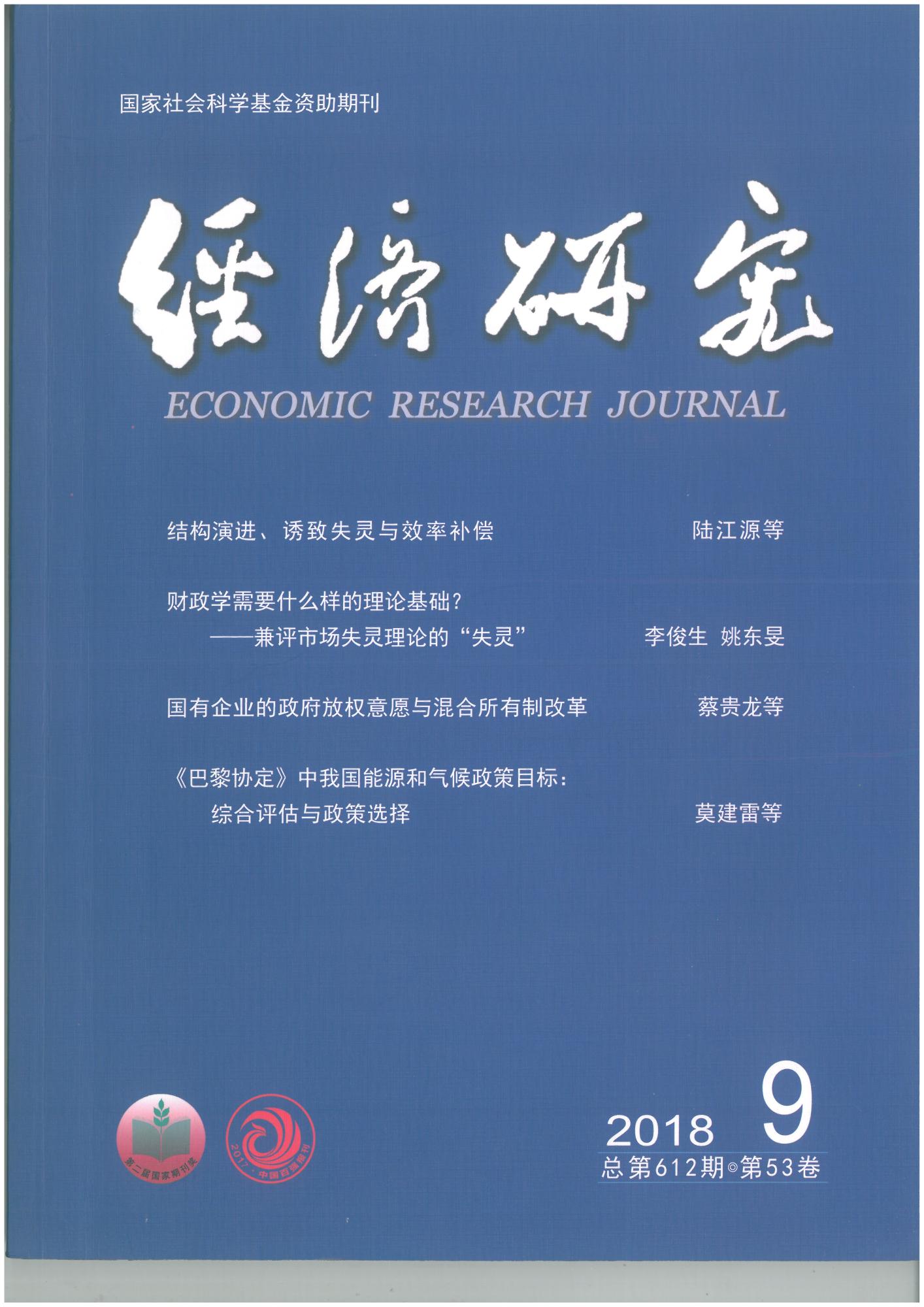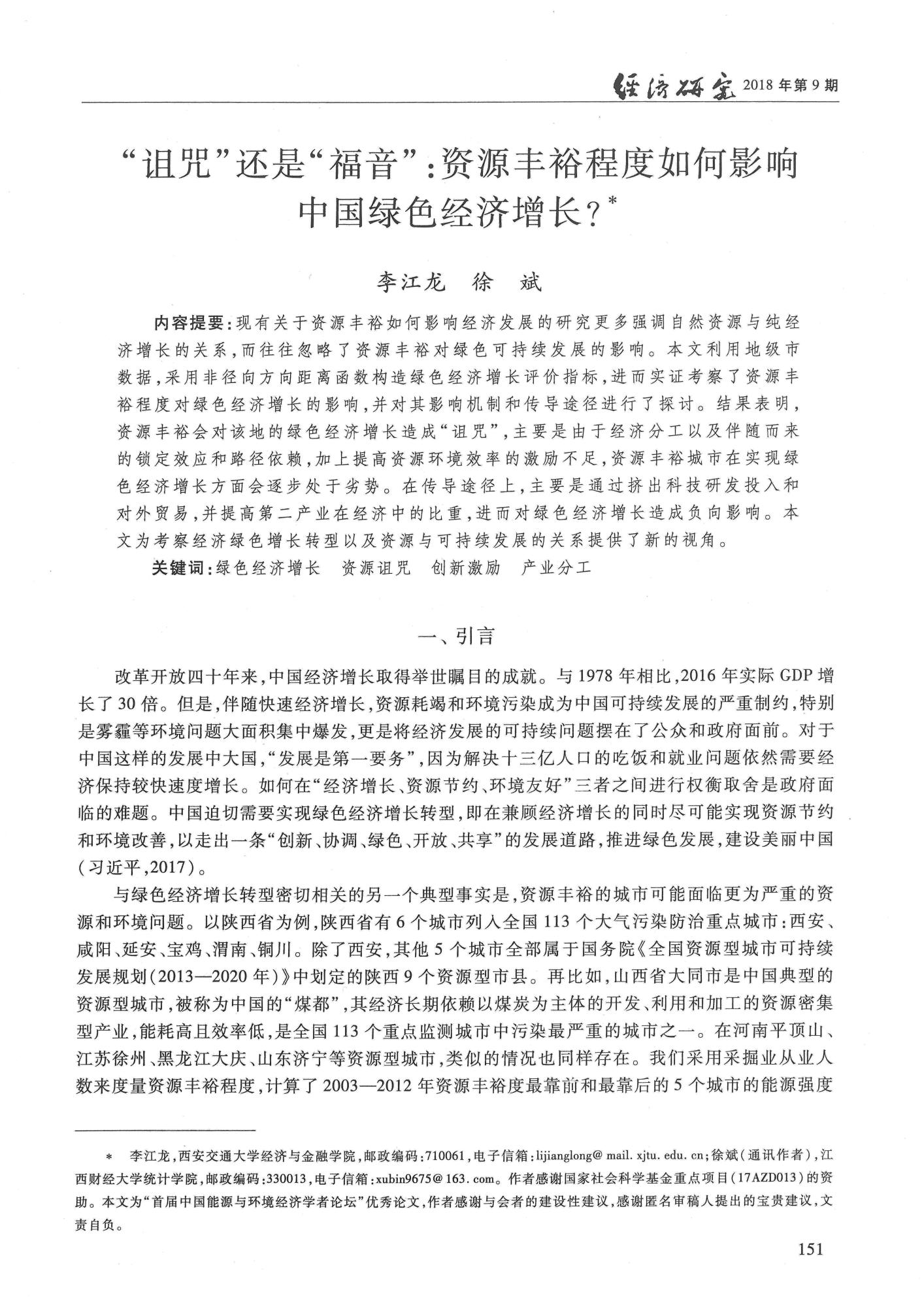 青年教师李江龙作为第一作者在国内顶级经济学权威期刊《经济研究》2018年第9期发表论文《“诅咒”还是“福音”:资源丰裕程度如何影响中国绿色经济增长?》。