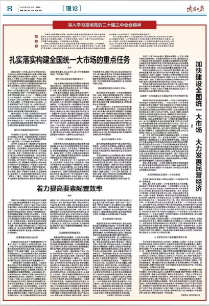 党的二十届三中全会提出,要构建全国统一大市场,完善市场经济基础制度。加快建设全国统一大市场,是完善社会主义市场经济体制的内在要求,是构建新发展格局的坚强支撑,它能更好发挥市场调节作用、发挥市场机制优胜劣汰的资源配置作用,引导投资和产业流向,促进产品及产业升级,形成充满活力的市场竞争格局,从而为经济高质量发展提供有力支撑。