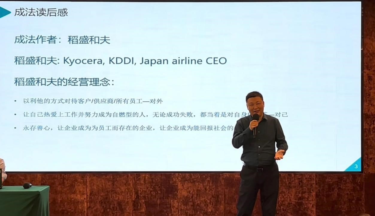 有了第一期成功举办的经验,读书会的同学们又紧接着筹备了第二期——《成法》-稻盛和夫的运营管理理念。领读人李勇从管理学的四种人格假说开场,介绍了稻盛和夫的“利他就是利己”的企业管理思维,强调企业管理者需要为员工创造有价值感的工作环境以及工作理念。