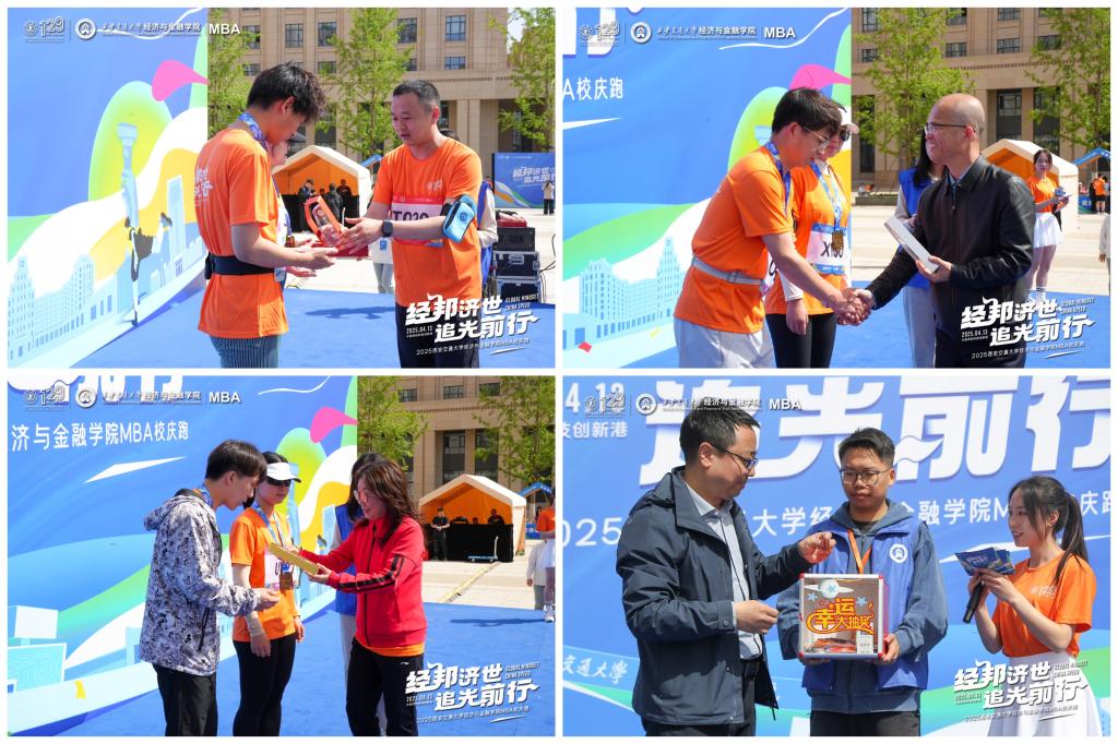 经过激烈角逐,男子组与女子组前三名在终点舞台荣耀加冕,学院MBA中心导师代表宋丽颖教授、温军教授和李聪教授为获奖选手颁发特制奖杯。MBA中心主任马草原教授现场抽取了三名幸运观众,赠送限量版校庆纪念品。赛事之余,活动还特别策划了“矢志不渝”“向西而行”“上下一心”等主题互动区,参赛选手及亲友团在完赛后可参与游戏挑战、兑换学院定制的文创产品,不同国籍、不同年龄的参赛者在欢声笑语中拉近彼此距离。